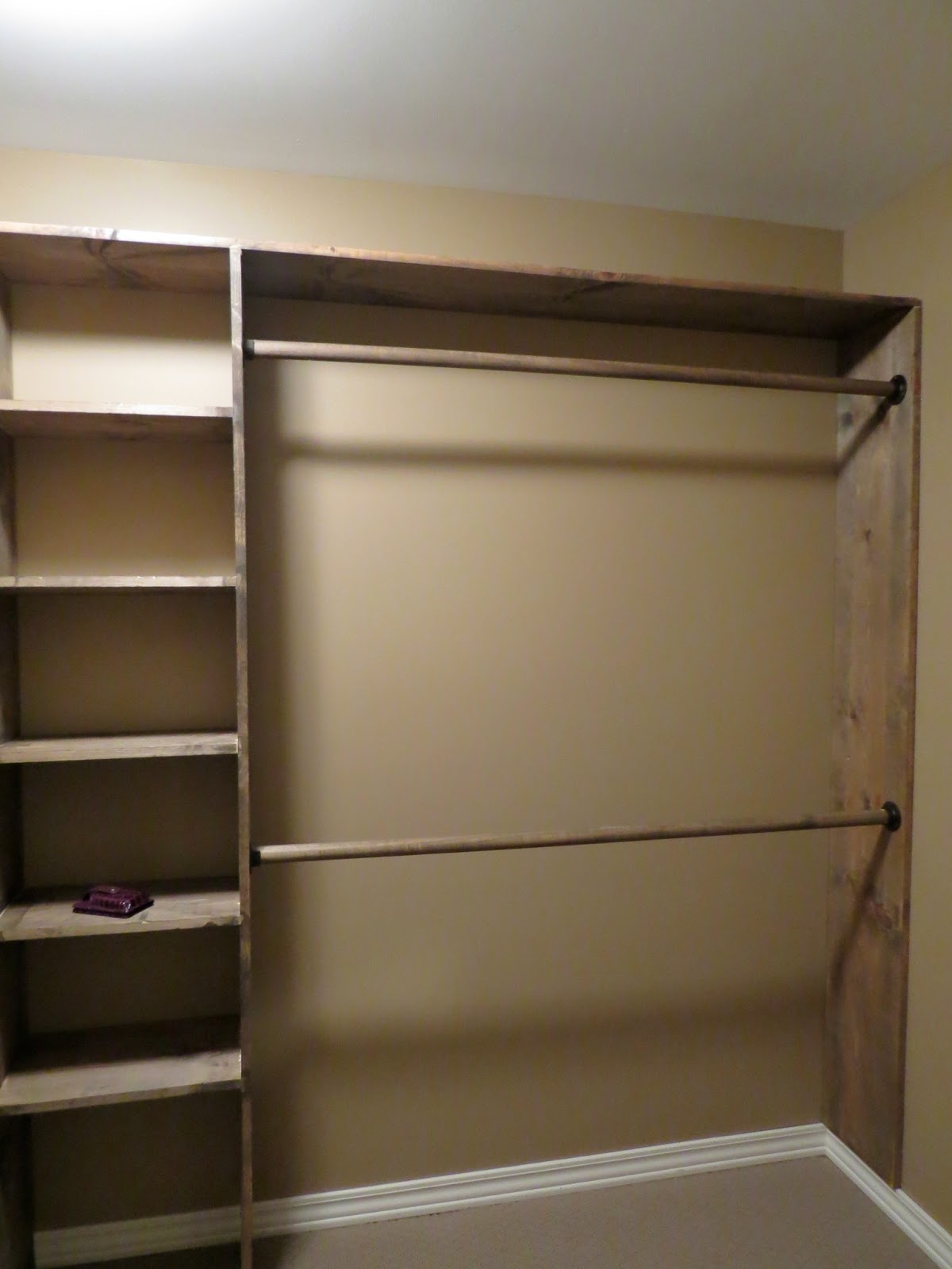 You can create your own drawers using a closet system, and hangers and storage boxes are easy to find. It does not take a professional to build a closet only a willingness to set aside some time. All hope is not lost, we swear. I recently finished a bathroom in our basement next to our bedroom and left a space just outside the bathroom with the intention of turning it into a closet.