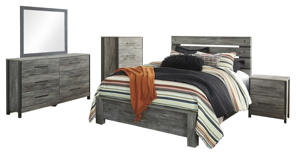 Harlinton 6 Piece Queen Bedroom. 6 piece queen size rustic mahogany with solid wood dark ebony frame panel bedroom set (bed, dresser & mirror, chest, 2 constructed from wood, this sustainable bed features a solid wood frame that showcases the wood's knots and grain variation. Queen bed, dresser, mirror, chest and 2 night stands.